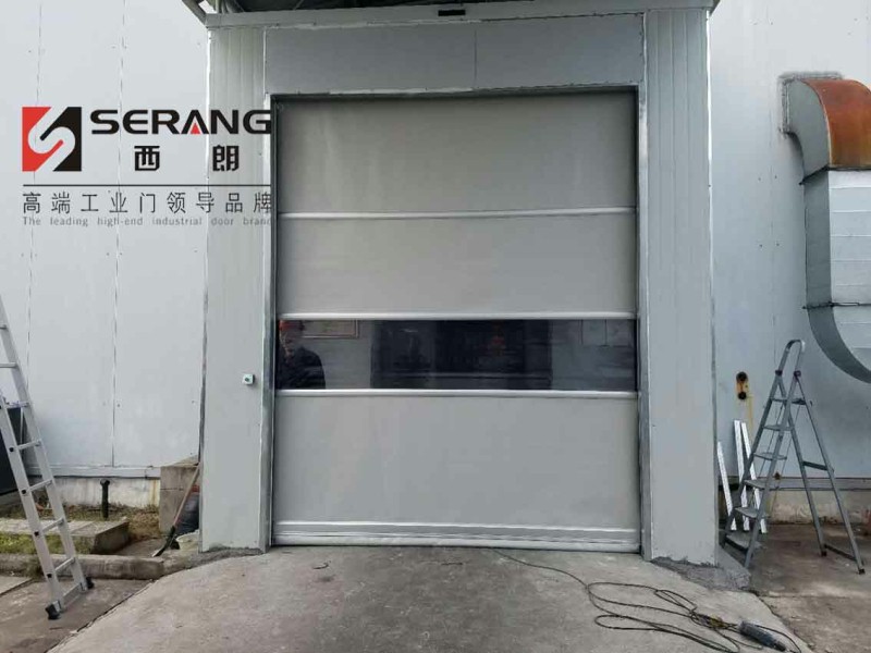 PVC快速卷帘门使用灰色门帘,和厂房外观颜色一致,整体美观、协调。符合企业使用要求。